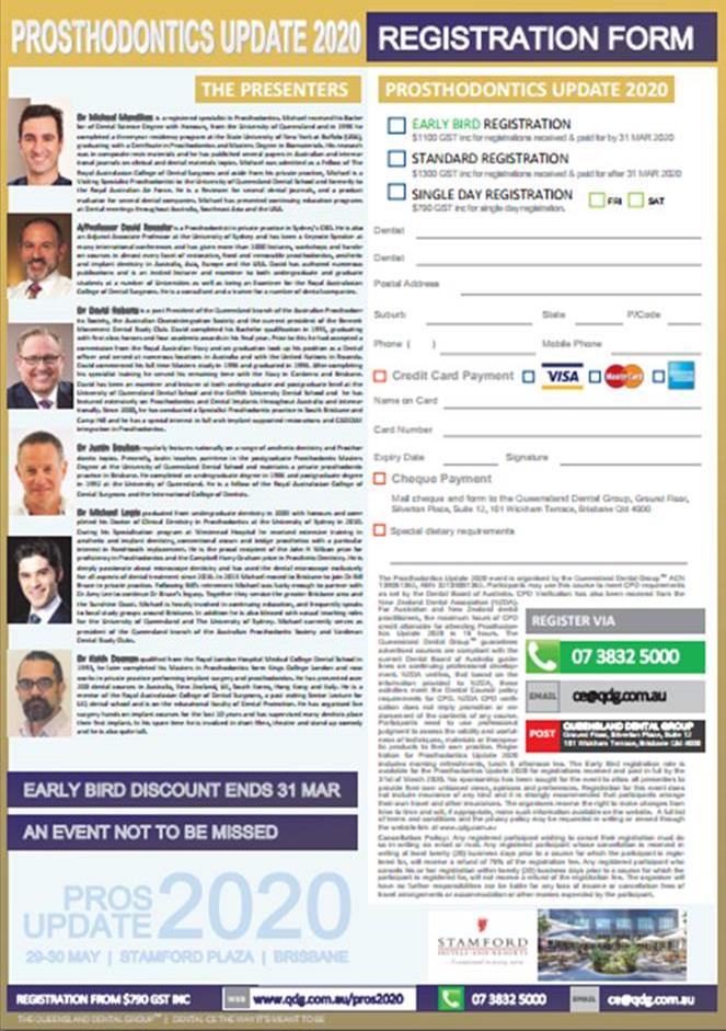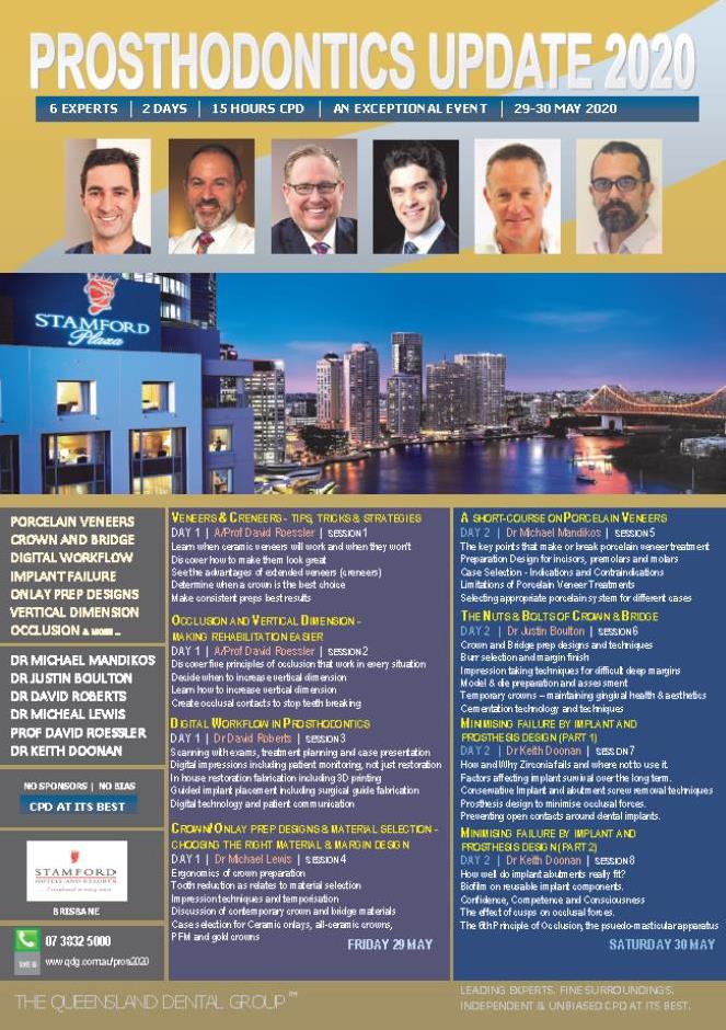 Prosthodontics Update 2020 marks the Queensland Dental Group’s 48th event and the two day event sees leading experts, including Dr Michael Mandikos and A/Professor David Roessler, present their updates on porcelain veneers, crown and bridge, occlusion and the vertical dimension, reducing implant failure and digital workflow as well as material selection, impression techniques and prep designs in the fine surroundings of the Brisbane Stamford Plaza Hotel 29-30 May. Don’t miss this exceptional event.